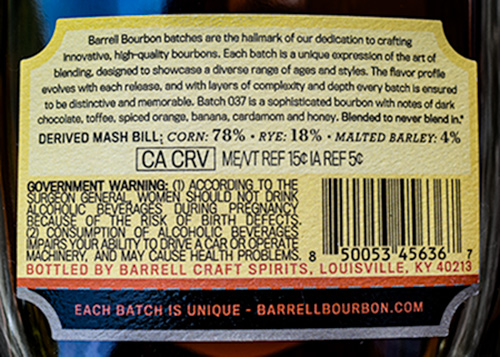 With a very good, viscous mouthfeel, the palate opens with oak-forward flavors of brown sugar, toffee, chocolate, and cola, followed by orange peel, stone fruit, green tea, toasted oak, and cinnamon spice. The flavors and balance are excellent. Batch 037 drinks very easy at its 111.38 proof but carries the flavor intensity of a higher-proof bourbon.